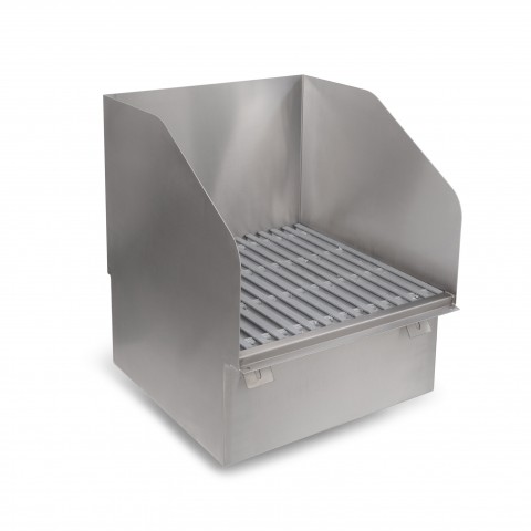 Mop sink, flush floor mount, 21-7/8"W x 23-7/8"D, 21-11/16"W x 21-11/16" front-to-back x 10" deep compartment, subway-style fiberglass grating, 17" tall side and rear splashes, accomodates up to a 4" diameter pipe, includes stainless steel removable perforated strainer, 14/300 stainlesss steel construction