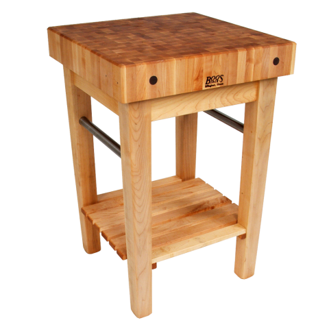 Pro Prep Butcher Block, 24"W x 24"D x 36"H overall size, 4" thick end grain top, Northern Hard Rock Maple, with Oil Finish, Northern Hard Rock Maple slatted shelf, 1-1/4" round stainless steel tie bars