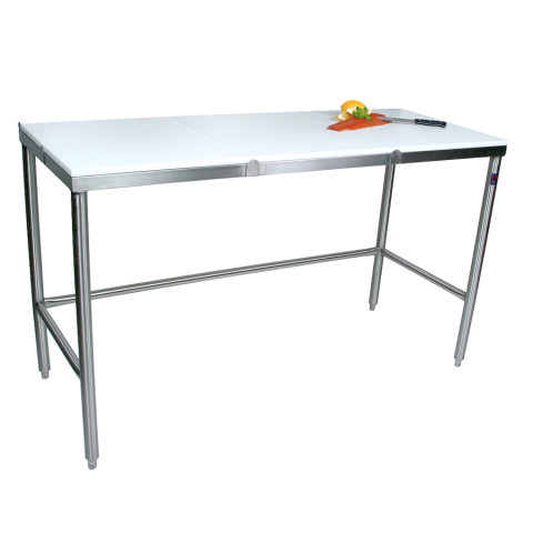 Trimming Table, 108"W x 36"D, 3/4" reversible poly flat top, stainless steel legs & bullet feet, side & rear bracing, welded set-up, NSF
