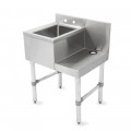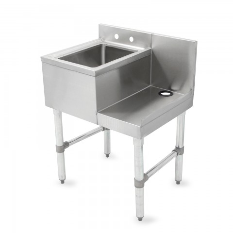 Slim-Line Underbar Blender Station, freestanding with dump sink, 24"W x 18"D x 32-1/2"H overall size, 12"W blender shelf on right, 10"W x 14" front-to-back x 6" deep fabricated sink bowl, 3"H backsplash on left, (1) set of removable splash mount faucet holes with 4" centers, 18/300 stainless steel construction, stainless steel legs & side bracing, adjustable stainless steel bullet feet, NSF (weights are subject to additional packaging)