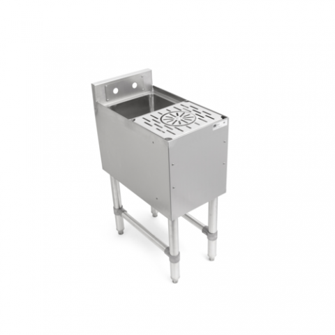 Underbar Dump Sink, freestanding, 12"W x 18"D x 32-1/2"H overall size, (1) 10"W x 8" front-to-back x 6" deep fabricated sink bowl, push-down rinser faucet, 3"H backsplash, (1) set of removable splash mount faucet holes with 4" centers, includes 9-1/2” x 6” x 5” deep perforated dump basket, 18/300 stainless steel construction, stainless steel legs & side bracing, adjustable stainless steel bullet feet, NSF (weights are subject to additional packaging)