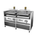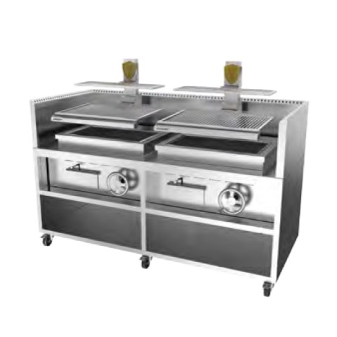 Basque Grill, charcoal, 82-1/4"W, insulated, (2) 30"W x 20-1/8"D braising areas, adjustable grill racks, (2) removable tempering grates, lower open storage compartments, grease tray, hydraulic height regulation system, combustion shield, includes: tongs, poker & ash drawer, casters, NSF, CE, UL