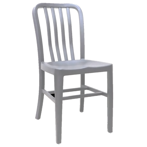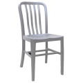 Industrial Collection Side Chair, metal slat back, metal seat, for indoor/outdoor use, classic (Navy) style, welded construction, double braced leg stretcher, rubber under-edge protectors, vinyl covered nickel insert style swivel glides, aluminum frame, brushed finish, Quick Ship
