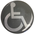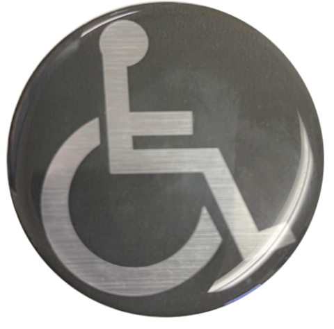 ADA Sticker For Table Tops, round, 2" dia., handicap label, domed acrylic, permanent adhesive, , white with grey background on brushed silver, flexible