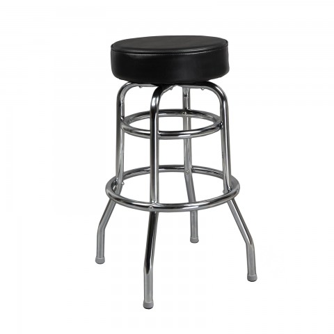 Swivel Bar Stool, backless, round upholstered padded seat, double ring, welded 18 gauge steel frame with chrome finish, flat white nylon glides, 100,000 DR black vinyl, Quick Ship