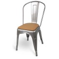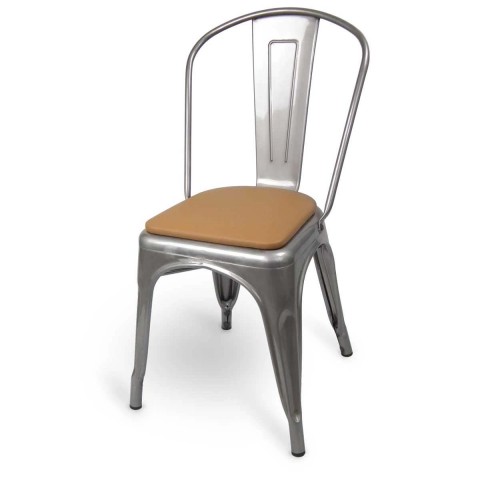 Industrial Collection Stacking Side Chair, galvanized metal back, upholstered 1" padded seat, tolix style, indoor use, welded construction, galvanized metal frame, stacking bumpers, black insert-style rubbberized plastic glides, grade 3 uph.