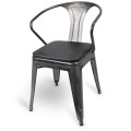 Industrial Collection Stacking Arm Chair, galvanized metal back, upholstered 1" padded seat, tolix style, indoor use, welded construction, galvanized metal frame, stacking bumpers, black insert-style rubbberized plastic glides, grade 1 uph.