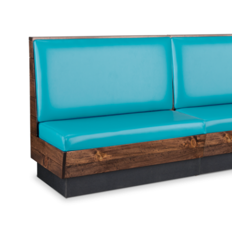 Custom Booth, banquette, 42"H, horizontal, wood-clad frame with tapered front, wood clad sides and inside front with 3" padded seat, wide top cap, floating seat pad, and finished outside back in wood-cladding, PVC kick plate, grade 2 uph, (priced per foot)