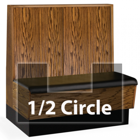 Custom Booth, half-circle banquette with 2 corners, 48" x 90" x 48"L, 48"H, wood plank frame, wooden back, removable padded seats, unfinished outside back, grade 2 uph