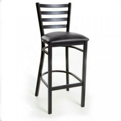 Bar Stool, ladder back, upholstered padded seat, welded 18 gauge steel frame with textured black powder coat finish, foot rest, black nylon glides, upholstery to be specified