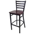 Bar Stool, ladder back, solid wood seat, welded 18 gauge steel frame with textured black powder coat finish, foot rest, black nylon glides