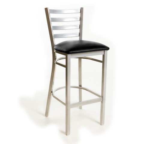 Bar Stool, ladder back, upholstered padded seat, welded 18 gauge steel frame with powder coat silver/chrome finish, foot rest, white nylon glides, 100,000 DR black vinyl, Quick Ship (seat shipped loose)