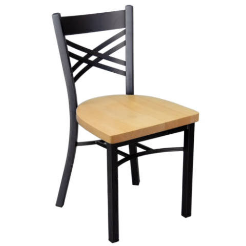 Side Chair, X-back, solid wood seat, welded 18 gauge steel frame with textured black powder coat finish, black nylon glides