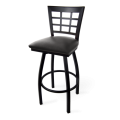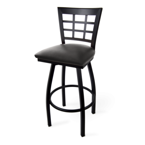 Swivel Bar Stool, window back, upholstered 2-1/2" padded seat, welded 18 gauge steel frame with textured powder coat finish, foot rest, black nylon glides, upholstery to be specified