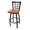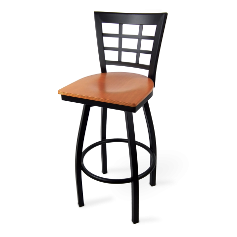 Swivel Bar Stool, window back, veneer wood seat, welded 18 gauge steel frame with textured powder coat finish, foot rest, black nylon glides