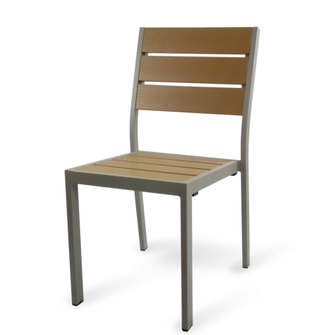 Stacking Side Chair, outdoor use, tan perma-wood™ back & seat, welded aluminum frame with champagne powder coat finish, weather-proof, natural pressed faux teak