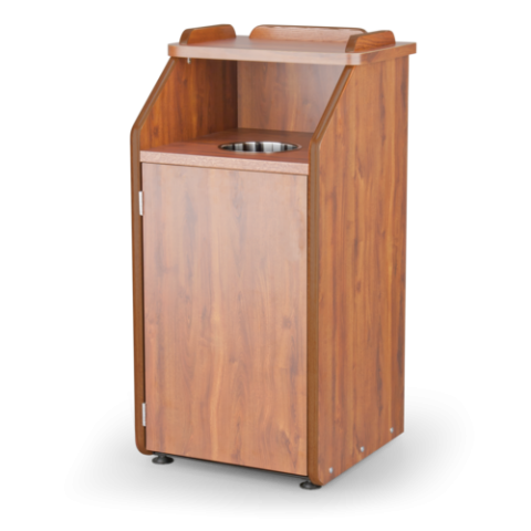 Trash Receptacle, 23-1/2" x 23-1/2" x 48", with drop chute and tray shelf, single, includes 35 gallon square liner, push lock hinge door, stainless steel chute liner, front recessed kick plate, black interior, melamine laminate, thick t-mold edge trim, Wilsonart® grade 3 laminate (4 week lead time)