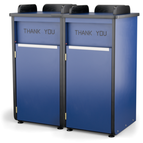 Trash Receptacle, 45" x 23-1/2" x 48", double, includes 35 gallon square liner, push lock hinge door, 2" tall tray return, 8" vinyl "Thank You" on swing door, front recessed kick plate, stainless steel drop edge, black interior, HPL standard laminate, Wilsonart® grade 1 laminate (4 week lead time)