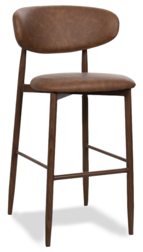 Petal Barstool, curved floating back, upholstered tufted pullover back, upholstered pullover padded, steel frame with wood-look transfer powdercoat, grade 3 uph