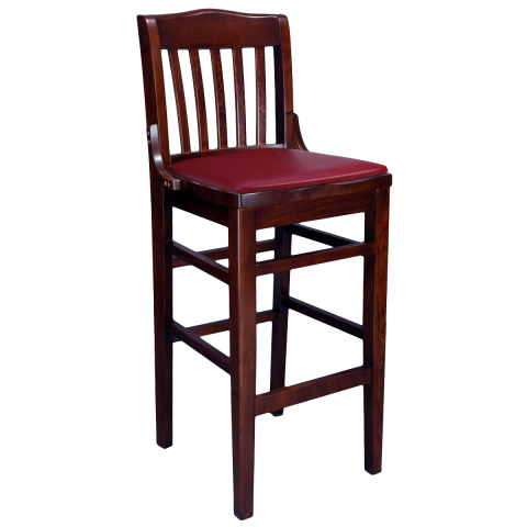 Bar Stool, schoolhouse slat back, upholstered fixed upholstered seat cushion mounted to top of wood seat, German beech wood frame, foot rest, non-marring nylon glides, ships assembled, grade 3 uph.