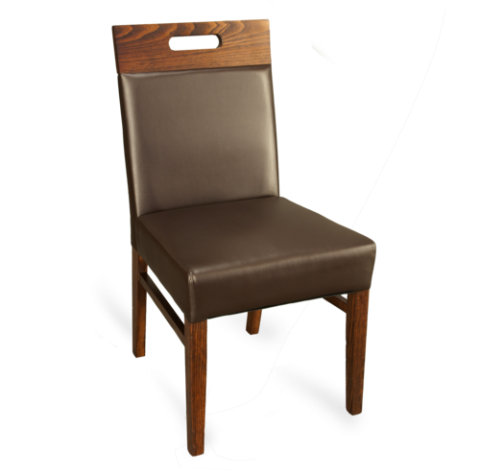 Side Chair, upholstered padded square inset back, handhold back, pull-over spring seat, German beech, tongue & groove hardwood construction, expresso vinyl, walnut frame, Quickship