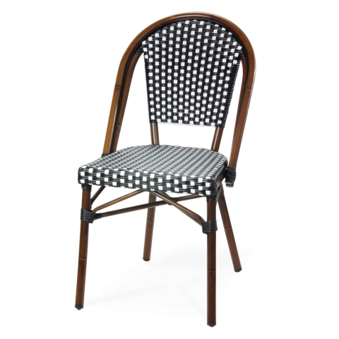Side Chair, upholstered back and seat, indoor or outdoor use, black insert‐style nylon glides, black and white rattan style woven vinyl with black welt‐cord, fully welded aluminum frame with walnut wood‐look finish