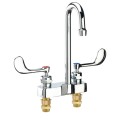 Krowne Royal Series Lavatory Faucet, deck mount, 4" centers, rigid gooseneck spout, 1/4 turn ceramic cartridge valves, wrist blade handles, 0.5 GPM aerator installed (includes 1.5 GPM aerator), brass construction, polished chrome finish, NSF, cCSAus, ADA Compliant