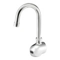 Krowne Royal Series Electronic Faucet, single splash-mounted, 4-1/2" gooseneck spout, infrared sensor, battery powered (4 AA alkaline 1.5V batteries) or power supply (AC adapter not included), low battery indicator light, 30 second time out & 1 second closing delay, includes mixing valve, internal check valves to prevent backflow & cross contamination, polished chrome finish, low lead compliant, NSF, cCSAus, ADA Compliant