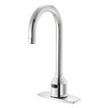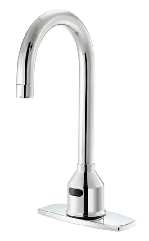 Krowne Royal Series Electronic Faucet, deck mount, single hole, 6" rigid gooseneck spout, deck plate, infrared sensor, battery powered (4 AA alkaline 1.5V batteries) or power supply (AC adapter not included), low battery indicator light, 30 second time out & 1 second closing delay, includes mixing valve, internal check valves to prevent backflow & cross contamination, polished chrome finish, NSF, cCSAus, ADA Compliant