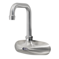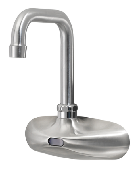 Krowne Royal Series Electronic Faucet, wall mount, 4-1/2" double bend spout, 4" centers, infrared sensor, battery powered (4 AA alkaline 1.5V batteries) or power supply (AC adapter not included), low battery indicator light, 30 second time out & 1 second closing delay, includes mixing valve, internal check valves to prevent backflow & cross contamination, brushed nickel finish, fits all Krowne hand sinks, NSF, cCSAus, ADA Compliant
