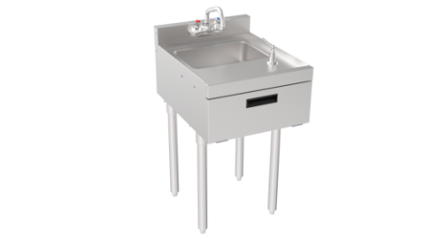 Silver Series Hand Sink with Soap and Towel, 18" W x 22.5" D, 10"D x 14"W x 9.5"H bowl size, 1-1/2" drain, 3” H backsplash with 4” center wall mount faucet included with quarter turn ceramic valves, Durable stainless steel construction, 1-5/8” tubular legs with gray plastic bullet feet, Pre-drilled rivnuts for easy attachment in the field, NSF