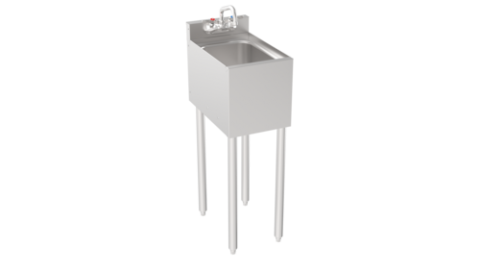 Silver Series One Compartment Sink, 12" W x 18.5" D, 10"D x 14"W x 7"H bowl size, 1-1/2" drain, 3” H backsplash with 4” center wall mount faucet included with quarter turn ceramic valves, Durable stainless steel construction, 1-5/8” tubular legs with gray plastic bullet feet, Pre-drilled rivnuts for easy attachment in the field, NSF