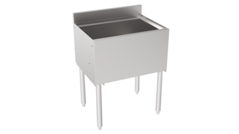 Silver Series Insulated Ice Bin with Full Sliding Cover, 24" W x 12" Deep x 22.5” front to back depth, 3” H backsplash, 1” drain, 1-5/8” tubular legs with gray plastic bullet feet, Durable stainless steel construction, Pre-drilled rivnuts for easy attachment in the field, NSF