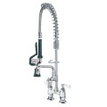Krowne Royal Series Space Saver Pre-Rinse Assembly, with add-on faucet, deck mount, 4" centers, spring action flexible gooseneck, 22-1/2"H stainless steel hose with 8" overhang & 1.2 GPM spray head, 8" riser, built in check valves, 2.0 GPM add-on faucet with 8" swing spout, includes wall bracket & mounting kit, chrome plated brass base, low lead compliant, includes internal check valves to prevent backflow & cross contamination, NSF (interchangeable with most brands) (ships pre-assembled)