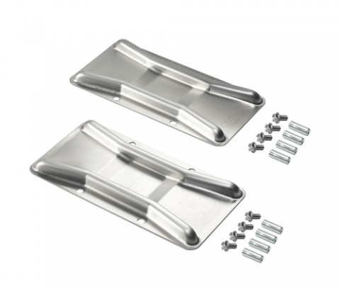 Krowne Stainless Steel Front Caster Positioning Set, includes (2) stainless steel chocks, (8) hex screws & (8) drop-in anchors