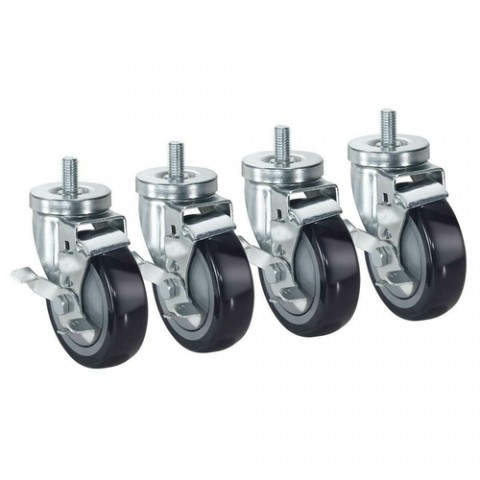Krowne Low Profile 1/2"-13 Threaded Stem Caster, 1" long threaded stem, 5" grease resistant wheels, weight capacity 200 lbs per caster, 4 pieces per set (2 with brake, 2 without brake)