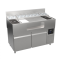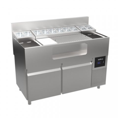 Alchemy Series - “The Forty-Eight Lab” is an innovative mise-en-place station with a generous 28” wide perforated cocktail prep area and an integrated garnish station above a fully insulated horizontal well. Also includes (2) additional 10” insulated wells on both ends with multi-use capabilities. Entire station is designed at an ergonomic 32.5” working height to bring the bar closer to the bartender. Refrigerated Base