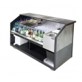 Bad Birdy Mobile Bar by Krowne – 66” W x 26” Deep, 45-3/4” overall height, 35-1/2” Bartender working height. From Left to Right: 8"W five-step liquor display, 18” x 19” ice bin with garnish cover, 24” x 19” Ice bin, 42” speedrail, and 12” waste sink with adjustable cutting board and 6" waste chute. 10”W x 46”L drop-in drainer in bar top. Open cabinet base beneath, 6-gallon gray water tank with spigot and 3-gallon trash can. Stainless steel construction with Wilsonart laminate, aluminum, black diamond plate, black vinyl corners and bar top. 4” casters. NSF