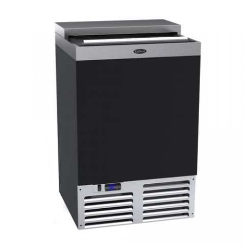 Bottle Cooler, flat top, 24"W x 24"D, self-contained refrigeration, (6) cases/12oz bottles capacity, (1) sliding lid, (1) adjustable chrome plated divider rack, digital thermostat, includes condensate evaporator, stainless steel interior, black vinyl clad exterior front & sides, R290 Hydrocarbon refrigerant, 1/5 HP, 115v/60/1-ph, 1.53 amps, cord with NEMA 5-15P, NSF7, ETL-Sanitation