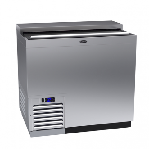 Bottle Cooler, flat top, 36"W x 24"D, self-contained refrigeration, (9.5) cases/12oz bottles capacity, (1) sliding lid, (2) adjustable chrome plated divider racks, digital thermostat, includes condensate evaporator, stainless steel interior, stainless steel exterior front & sides, R290 Hydrocarbon refrigerant, 1/5 HP, 115v/60/1-ph, 1.53 amps, cord with NEMA 5-15P, NSF7, ETL-Sanitation