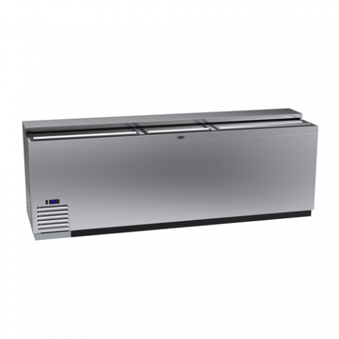 Bottle Cooler, flat top, 96"W x 24"D, self-contained refrigeration, (37) cases/12oz bottles capacity, (3) sliding lids, (5) adjustable chrome plated divider racks, digital thermostat, includes condensate evaporator, stainless steel interior, stainless steel exterior front & sides, R290 Hydrocarbon refrigerant, 1/3 HP, 115v/60/1-ph, 2.71 amps, cord with NEMA 5-15P, NSF7, ETL-Sanitation