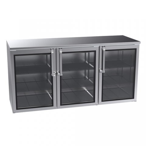 Remote Back Bar Storage Cabinet, three-section, 72"W x 24"D, remote refrigeration with side hook-up, galvanized steel sub top, interior lights, (3) hinged doors with locks, (2) adjustable epoxy coated shelves with floor rack, 1/2" drain, stainless steel interior, 115v/60/1-ph, 1.5 amps, NSF7 Open Food Certified, ETL-Sanitation
