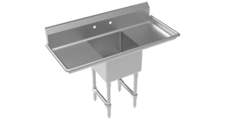 Royal Series 1-Compartment Commercial Sink with left & right drainboards, 54"W x 24"D x 43"H, 18"x 18" deep bowl with 4.5" drain, 38" working height, 18 gauge 304 Series Stainless Steel construction, stainless steel legs with adjustable thermoplastic bullet feet