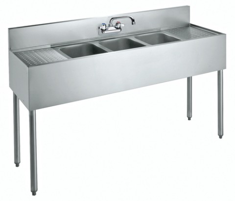 Convenience Store Sink, three compartment, 60"W x 19"D x 42-1/2"H, 6-1/2"H backsplash, 10" wide x 14" front-to-back x 10" deep compartments, 12" drainboards on left & right, 4" OC splash mount faucet with swing spout (low lead compliant), apron on front & sides, includes (3) 3-1/2" basket drains, stainless steel construction, stainless steel legs with adjustable plastic bullet feet, NSF