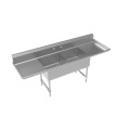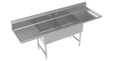 Royal Series 2-Compartment Commercial Sink with left & right drainboards, 96"W x 24"D x 43"H, (2) 24"x 24" deep bowls with 4.5" drains, 38" working height, 18 gauge 304 Series Stainless Steel construction, stainless steel legs with adjustable thermoplastic bullet feet