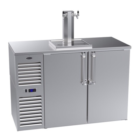 Draft Beer Cooler, two-section, 52"W x 25"D, side mounted self-contained refrigeration, does not include beer tower, 16.25" x 15" drain pan, 30°F to 40°F temperature range with DynamicChill 360° technology, (2) heavy duty self-closing doors with locks, (2) reinforced stainless steel keg floors and built-in kick plates, digital thermostat, 20 gauge stainless steel interior with coved corners, includes condensate evaporator, R290 Hydrocarbon refrigerant, 1/4 HP, 115v/60/1-ph, 2.2 amps, cord with NEMA 5-15P, ETLus, ETL-Sanitation