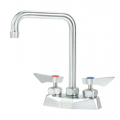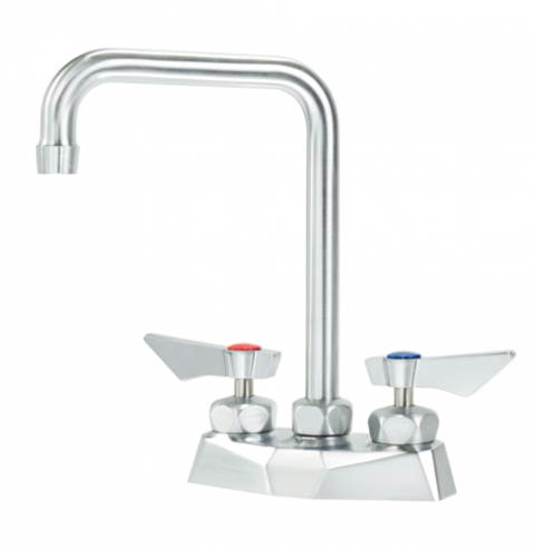 Krowne Diamond Series Faucet, Deck Mount, 4" Centers, 6" double bend spout, 1.8gpm aerator, ultra-polish satin finish, solid chrome plated brass base, lever handles, stainless steel 1/4 turn high-performance ceramic cartridge valves with integral check valve to prevent cross-contamination, 1/2" NPT male, (2) 3/8" stainless steel braided flexible supply hoses, includes 1/2" npt close elbows w/ swivel compression fittings on faucet side, and 3/8" compression fitting on water supply side, includes mounting nipples, washer, and lock nuts, LIFETIME WARRANTY, NSF, CSA