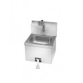 Hand Sink, wall mount, 15-3/4"W x 15-1/4"D x 19-1/4"H O.A., 8"H backsplash, 12-1/2" wide x 9-3/4" front-to-back x 6" deep bowl, splash mount gooseneck faucet with knee pedal valve (low lead compliant), stainless steel skirt on front & sides, includes mounting bracket, stainless steel construction, NSF