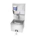 Hand Sink, wall mount, 16-3/16"W x 15-1/4"D x 33-1/2"H O.A., 8"H backsplash, 12-1/2" wide x 9-3/4" front-to-back x 5-5/8" deep bowl, splash mount gooseneck spout with knee pedal valves (low lead compliant), stainless steel skirt on front & sides, soap & towel dispenser, includes mounting bracket, stainless steel construction, NSF