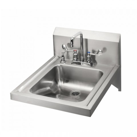 Hand Sink, wall mount, 14"W x 16" front-to-back x 5" deep bowl, 4" center deck mount faucet with wrist blades, 6" double bend spout, 1/4 turn ceramic valves, deck mount soap dispenser, wall bracket with (2) side supports, 304 stainless steel construction, NSF, cCSAus, ADA Compliant